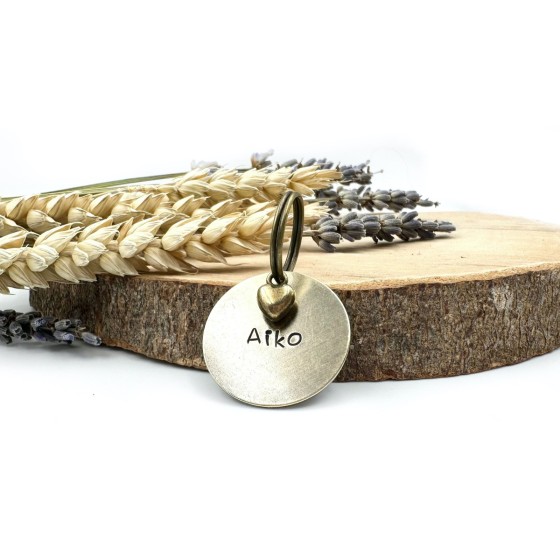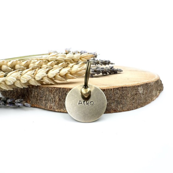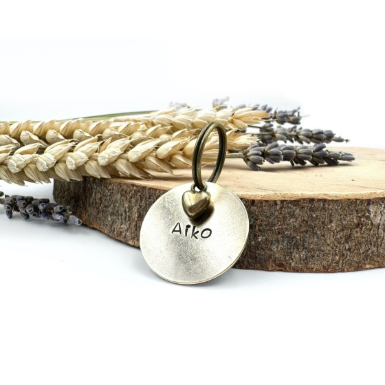 „Aiko“ ist eine handgestempelte Hundemarke mit Herz – persönlich, stilvoll und gemacht für kleine und große Abenteurer. ♡