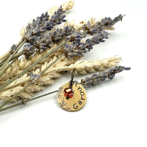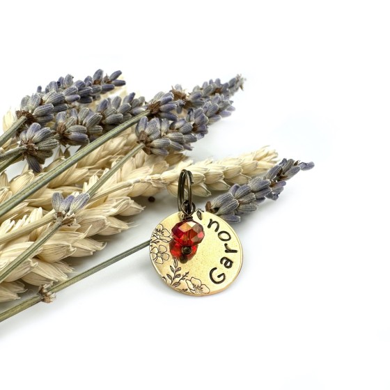 Handgestempelte Hundemarke aus Messing mit filigranem Blumenmuster und funkelnden Perlen, ein Hingucker an jedem Halsband.