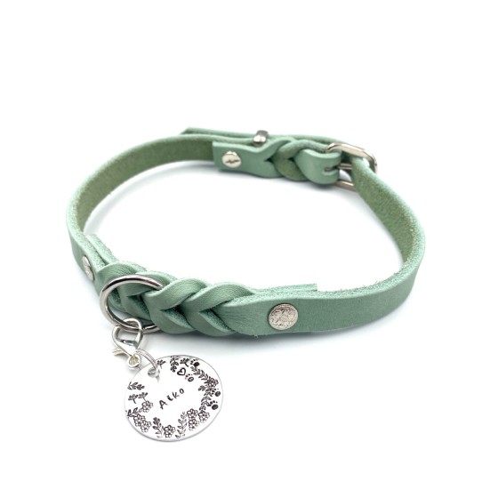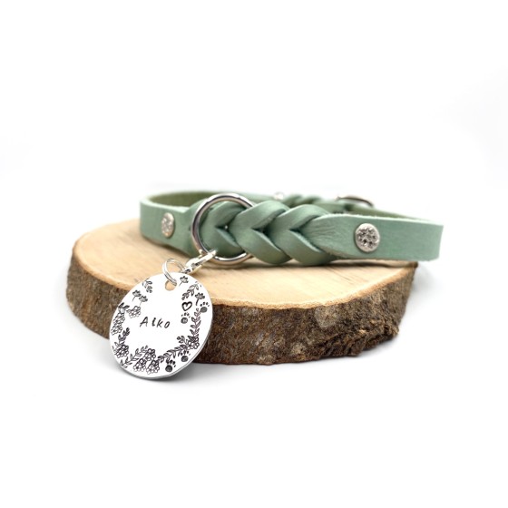Wunderschöne Führleine aus qualitativ hochwertigem Fettleder. Durch die eingeflochtenen Rundringe ist die Leine 2-fach grössenverstellbar. Silberne Buchschrauben mit Blümchen Muster geben der Leine einen frühlingshaften Flair.